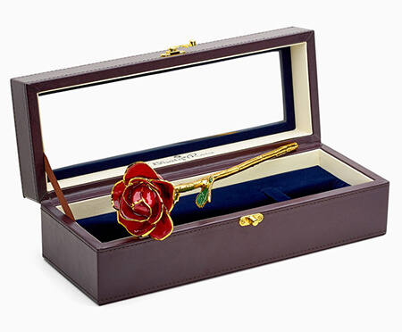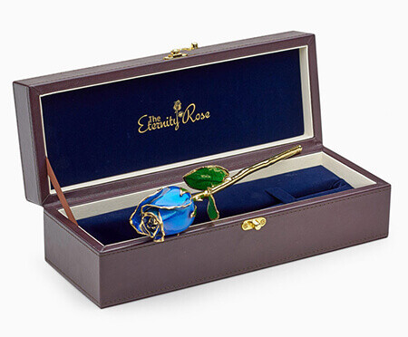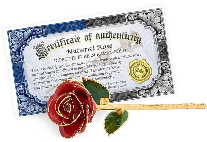 We grow natural roses, pick them at their perfect stage of bloom, and then coat them in genuine 24k gold, silver or platinum. We also preserve roses in their natural colour with glaze and gold-trimming. The range includes pendants and earrings made from natural rose petals which are also glazed and gold-trimmed. All products from The Eternity RoseTM are designed to last forever and come with a lifetime warranty.